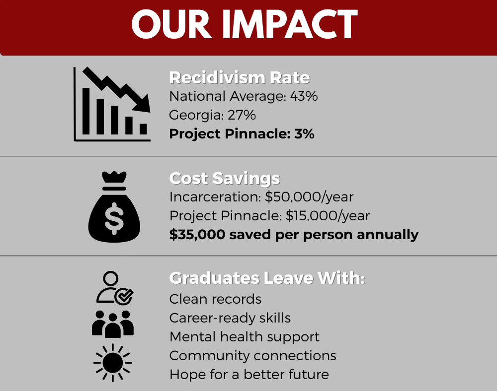 Project Pinnacle is a 501(3)(c) non-profit organization dedicated to redirecting emerging adults between the ages of 17-25 years old, who have been charged with a non-violent felony offense for the first time. Founded by the Honorable Asha F. Jackson, our program offers participants a genuine second chance—providing life-changing resources, skill-building, mentorship, and upon successful completion, full dismissal and sealing of their charges. We don’t just believe in rehabilitation—we invest in transformation. Our participants leave with more than a clean record; they leave with purpose, self-worth, and the skills to thrive.